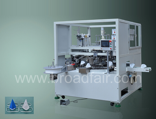 立體口罩頭掛熔接機(jī)為繼立體口罩本體后,采用超聲波焊接的方式將松緊帶按頭掛方式熔合于口罩兩側(cè),僅需一名操作員將口罩本體一個(gè)個(gè)置放于模具上,從塑料鼻線焊接到松緊帶焊接均由設(shè)備自動(dòng)完成。